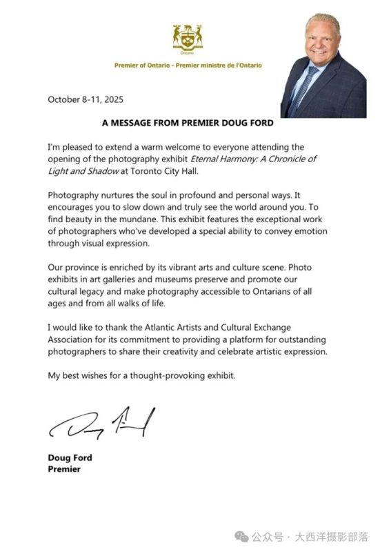 (《 国际艺术新闻网 》 特派记者勾芍人 、 马丽霞 2025 年 10 月 8 日多伦多报道)秋日的多伦多,阳光穿过市政厅玻璃穹顶,流泻在每一幅摄影作品上,如时间的手指轻抚岁月的纹理 。10 月 8 日,大西洋摄影家协会主办的 《 锦瑟无边,光影礼赞 》 摄影展在多伦多市政厅隆重启幕 ——106 幅凝结了艺术家心血与灵魂的作品,在光与影的交响中,奏响了一曲献给生命与自然的礼赞 。