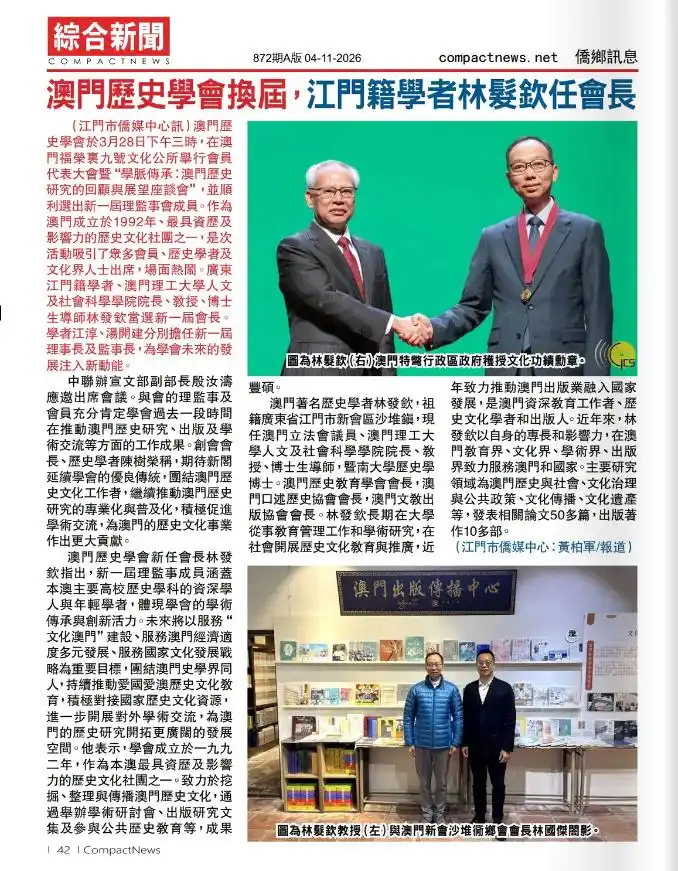 今年4月,江门市侨联、江门市侨媒中心联合推荐的侨乡故事:《澳门历史学会换届,江门籍学者林发钦任会长》(作者:黄柏军),被美国纽约华文媒体《综合新闻》新闻周刊(总第872期A版,2026年4月11日出版)录用发表。因为《综合新闻》新闻周刊身处美国华埠,使用繁体字排版,所以作者发出稿件时候,把简体字文稿转变成繁体字再发出,导致了繁体字一字多音、一字多用产生的错漏文字。经过香港、澳门、美国等多地读者的及时指正,笔者接受批评,马上修改。另,我们作为文字工作者,使用文字务求规范与准确,是则是,非则非,来不得半点含糊。所以作者愿意从自己做起,拿出手术刀,解剖自己写作中的失误,并希望以此为鉴,警示后来者。